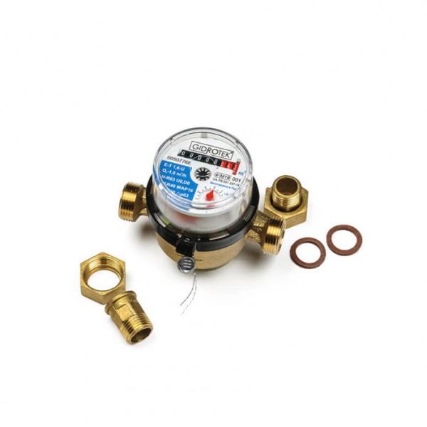 Лічильник холодної води 1/2" Гідротек E-T 1.5U Х 40 + сгін дає змогу неабияк заощаджувати. Застосування цього пристрою дає можливість платити тільки за використані обсяги, а не дірки в магістралях. Водомір Гідротек ідеально підходить для українських умов. Його вимірювальний механізм на основі крильчатки чудово переносить брудну воду в наших трубах, а два типи різі дають змогу його встановлювати в трубопроводи з різним діаметром. Лічильник для холодної води Gidrotek E-T 1.5U вирізняється простотою конструкції та високою герметичність, що запобігає потраплянню вологи в механізм обліку. Водомір Гідротек складається з магнітної муфти, корпусу, лічильника з редуктором, турбіни, патрубків під'єднання. Прилад вирізняється високою температурною стійкістю та відповідає вітчизняним стандартам. клас герметичності: у горизонтальному положенні — В, у вертикальному — А; температура робочої рідини: від +5 до +40 °C; номінальна витрата: 1,5 м3/год; максимально допустимий тиск: 10 атмосфер; різь патрубків: 3⁄4 дюйма; діаметр штуцерів для монтажа: ½"; максимальна витрата рідини в лічильнику Гідротек: 3 м3/год; діаметр: DN15; ширина: 75 мм ; довжина: 11 см; висота: 80 мм; гарантія від виробника: 4 роки; міжподорожний інтервал: 48 місяців; країна виробництва водоміра Gidrotek: Україна.