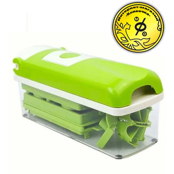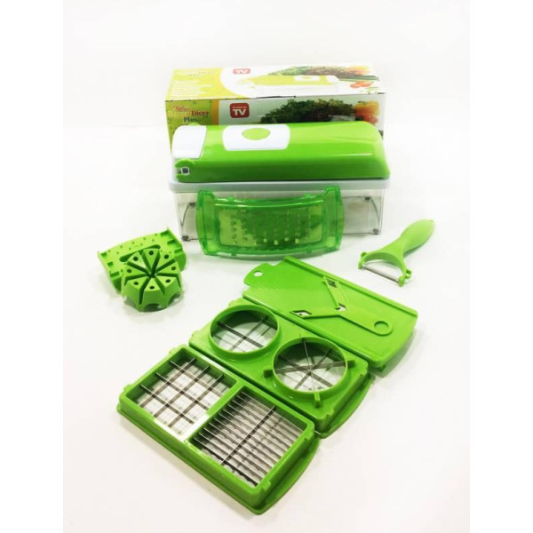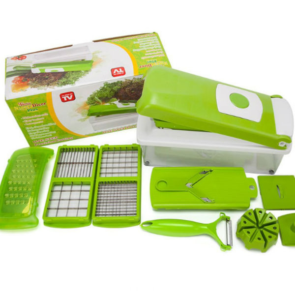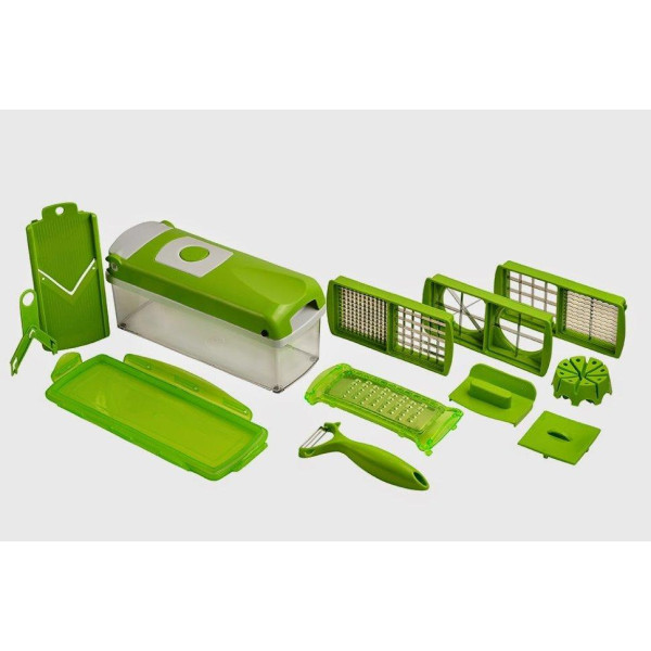 Овочерізка Найсер Дайсер дуже проста у використанні, має стильний дизайн, рівно і красиво нарізає всі види фруктів, овочів, сирів і навіть делікатесів. А герметична кришка Найсер Дайсер зберігає їжу свіжою, а тому в ній залишаються вітаміни і мікроелементи (заради яких ми і вживаємо таку кількість рослинності). Ви позбавляєтеся від необхідності використання безлічі різних кухонних приналежностей, наприклад таких як блендер, ножі, безліч овощечисток та інших речей, які займають багато місця на Вашій кухні. Саме з цієї причини, у цей комплект входять всі необхідні інструменти, такі, як терка, слайсер, лезо і т. Д. Легко и просто использовать Современный и красивый дизайн Нарезает все виды фруктов, овощей и сыров Контейнер с герметичной крышкой для хранения нарезанных продуктов Защита лезвий для безопасного мытья и хранения Антискользящие ножи Быстро моется и очищается Не занимает много места на кухне Не создаёт шум, в отличие от разных кухонных комбайнов А вы попробуйте сперва натереть морковь на тёрке, нарезать аккуратными кубиками мясо, а картошку – ломтиками, а потом ещё и фруктовый салат приготовить. Сколько это займёт у вас времени? Правильно: не менее часа. А з мультифункціональної овочерізкою Nicer Dicer Plus ви не проведете за цими нудними заняттями не більше 15 хвилин. Нарізати кубиками, соломкою, скибочками, кубиками, розрізати на 4, 8 шматочків або ж натерти — все за допомогою одного пристосування — простого, практичного і заощаджує ваш час!